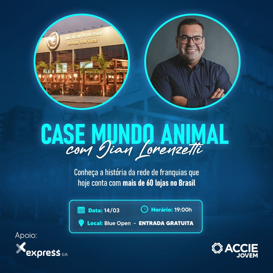 A ACCIE Jovem promove, no dia 14 de março, às 19h, palestra sobre o Mundo Animal, a rede de franquias que hoje conta com mais de 60 lojas em 11 estados brasileiros. O case será apresentado por Jian Lorenzetti, um dos sócios do empreendimento.