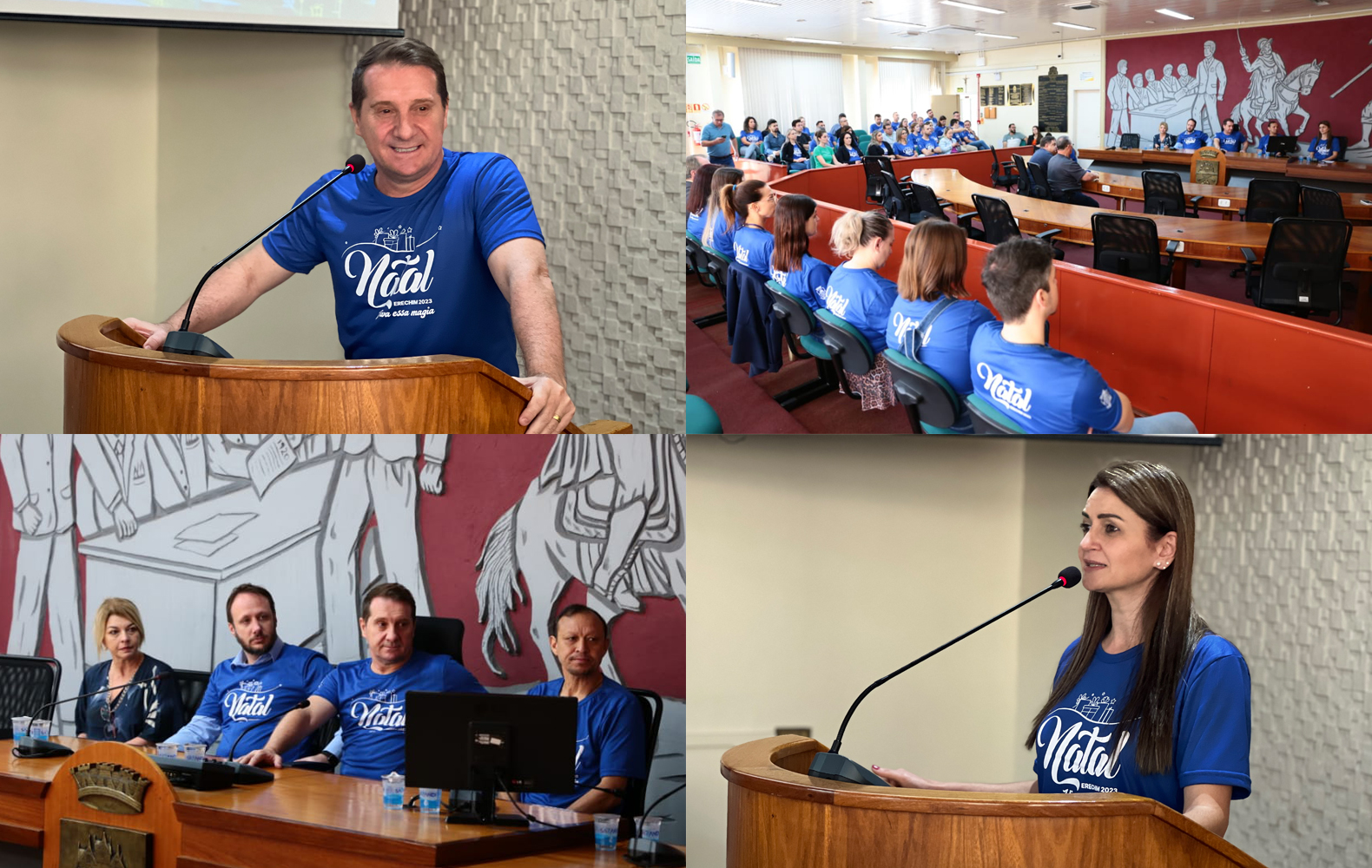 Quem passa pelas ruas do centro de Erechim já deve ter percebido a movimentação – a decoração do Natal Erechim 2023 – Viva essa magia, já está sendo instalada. Na manhã desta quarta-feira (1), foram apresentados na Câmara de Vereadores, o projeto arquitetônico e de programação. Estiveram presentes o prefeito Paulo Polis, o vice-prefeito Flávio Tirello, o presidente da Câmara de Vereadores, vereador Sérgio Alves Bento, a secretária de Cultura e Esporte, Carla Talgatti, a presidente da CDL Erechim, Débora Lunardi, entre outras autoridades, servidores e imprensa. A atividade foi transmitida ao vivo pela TV Câmara Erechim.