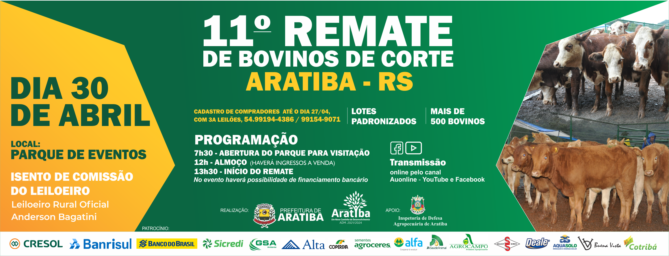 O Remate contará com leiloeiro oficial (Anderson Bagatini), terá isenção de comissão do leiloeiro e contará com lotes padronizados. O Cadastro de Compradores deverá ser feito até o dia 27, com a 3A Leilões, pelos números de telefone (54), 99194-4386 ou 99154-5071.