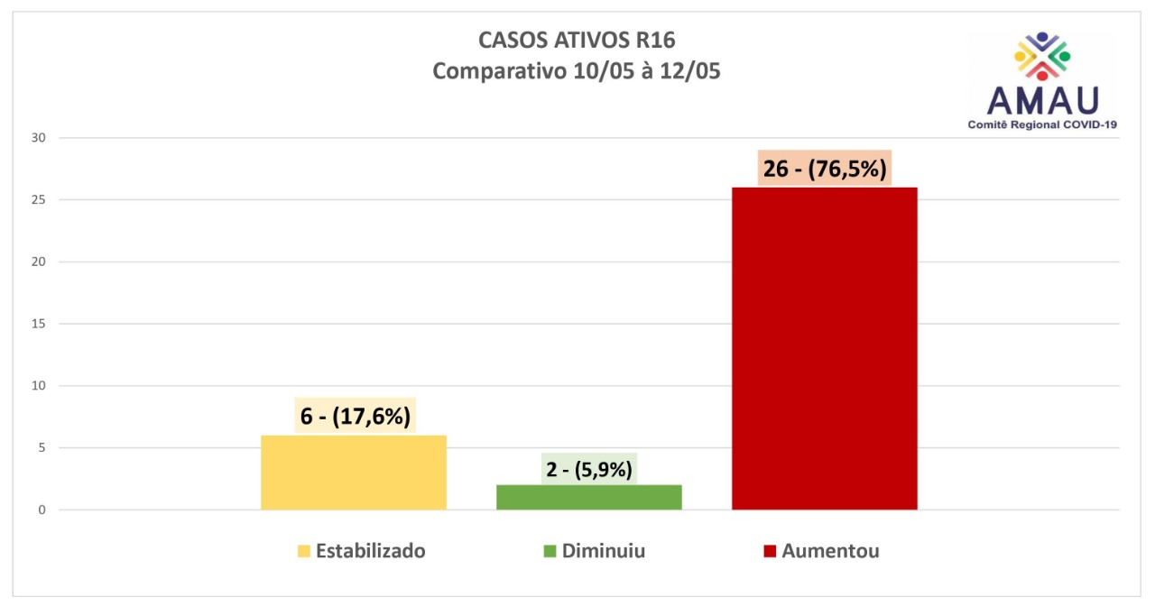 Persistindo nas avaliações, uma das atribuições do comitê regional, verificamos que dos 34 municípios alvo de monitoramento, 26 municípios apresentaram mais casos ativos, o que dá um percentual de 76,47%, e nos leva a pressupor que o crescimento não é pontual e, sim, uma tendência regional. Seis (06) municípios apresentaram estabilidade, portanto o mesmo número de casos, e apenas dois (02) reduziram o número de ativos.
