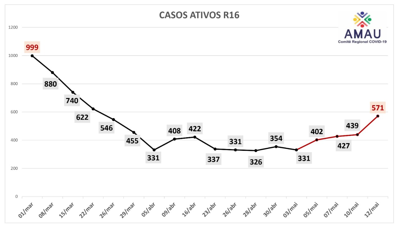 Analisando o gráfico verificamos que em 01/03 a região apresentou 999 casos ativos e, a partir de uma série de ações e sucessivas classificações de bandeira preta (altíssimo risco), os números começaram a diminuir, atingindo em 03/05 o piso de 331 casos ativos.