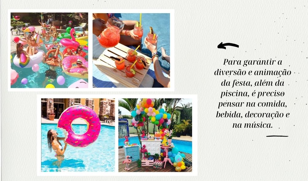 Gostou da ideia? Então vamos lá! Para garantir a diversão e animação da festa, além da piscina, é preciso pensar na comida, bebida, decoração e na música.
