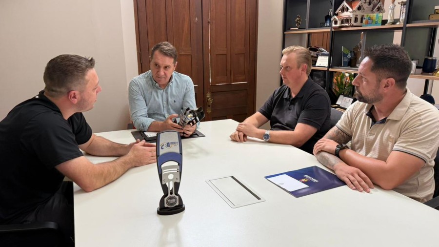 O prefeito Paulo Polis e o secretário de Agricultura, Abastecimento e Segurança Alimentar, William Racoski, receberam no gabinete, nesta quarta-feira (8), o esportista Júlio Sachet, campeão brasileiro de automobilismo de velocidade em pista de arrancada na categoria DTB.