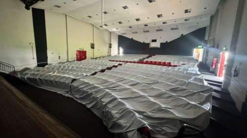 Na sequência, será realizada a troca do forro de gesso, comprometido por infiltrações decorrentes dos danos na cobertura. A etapa final da reforma prevê a substituição do carpete e a higienização das cadeiras do espaço, também afetadas pela entrada de água durante o temporal.