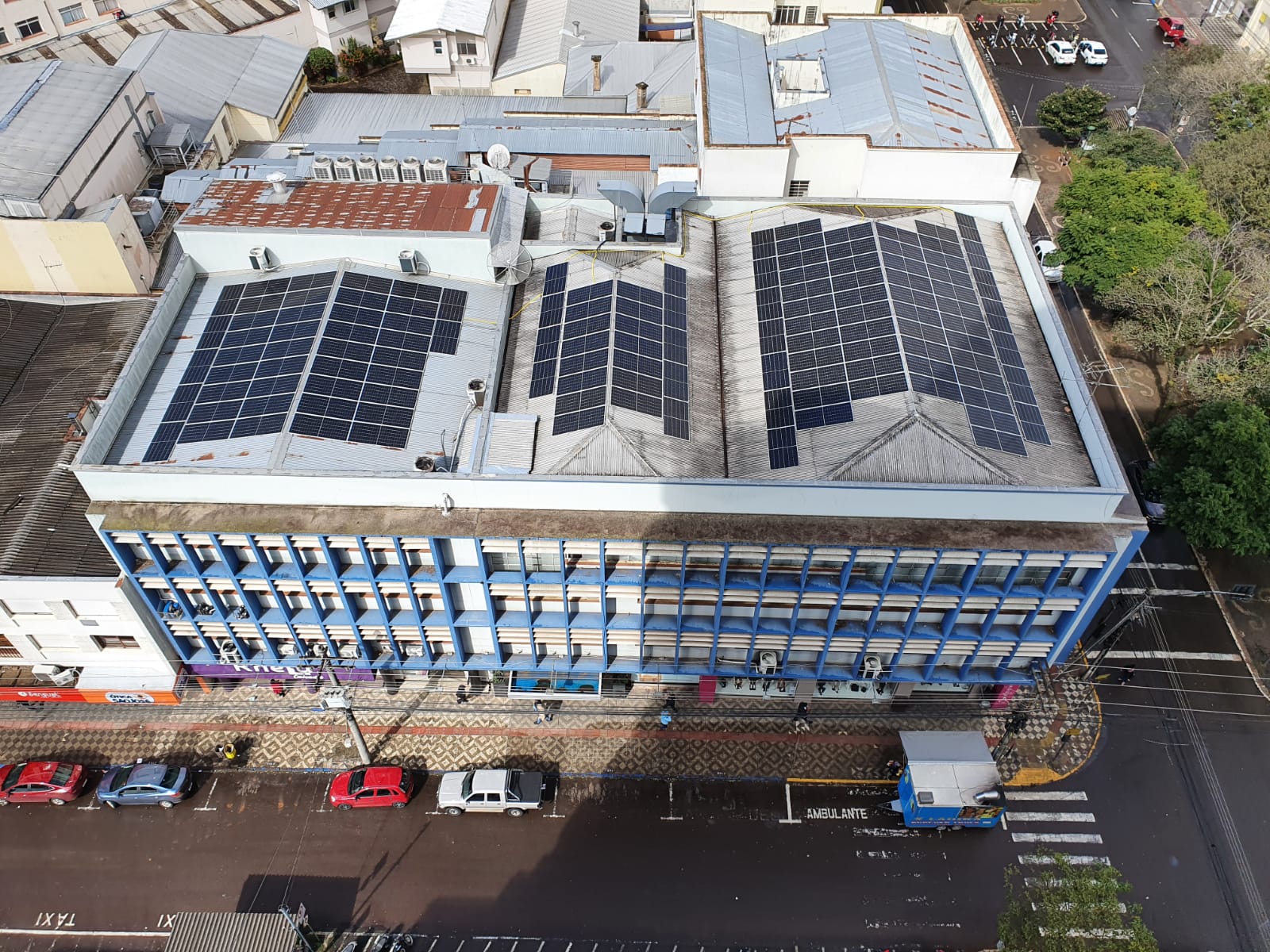 O Clube do Comércio de Erechim acaba de instalar um sistema próprio de geração de energia elétrica a partir da energia solar fotovoltaica. Ao total são 126 painéis fotovoltaicos instalado no telhado do Clube, que irão gerar uma economia anual de R$ 70.264,00 e estimada em 25 anos de R$ 2.313.040,00. O retorno total do investimento, que foi de R$ 220 mil, financiado pela Unicred, se dará em quatro anos. A potência instalada é de 69,3 kWP.