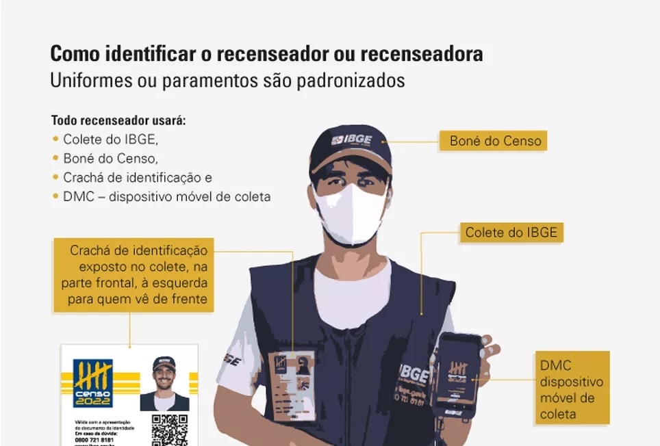 Segundo o IBGE, os recenseadores estarão sempre uniformizados, com o colete de identificação, boné do Censo, crachá e o Dispositivo Móvel de Coleta (DMC). É possível confirmar a identidade do agente do IBGE no site Respondendo ao IBGE (respondendo.ibge.gov.br) ou pelo telefone 0800 721 8181.