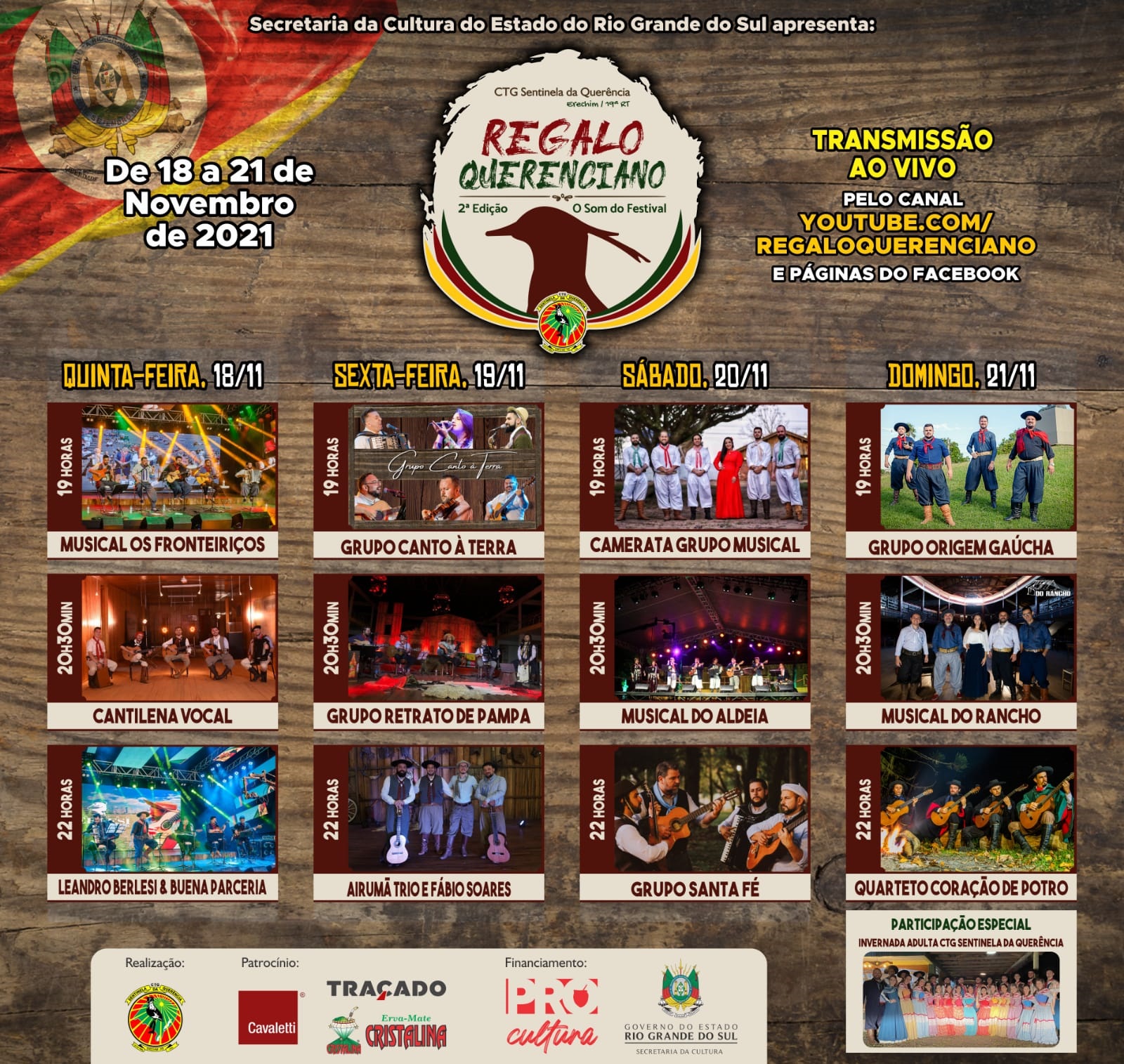 O evento será realizado nos dias 18, 19, 20 e 21 de novembro, com a participação de doze grupos vocais do estado, apresentando composições de autoria própria, além de músicas regionalistas que marcam o cenário musical gaúcho. A transmissão será ao vivo através do Youtube do Regalo Querenciano, do Facebook do CTG Sentinela da Querência, do Movimento Tradicionalista Gaúcho, da Estampa da Tradição e do Regalo Querenciano.