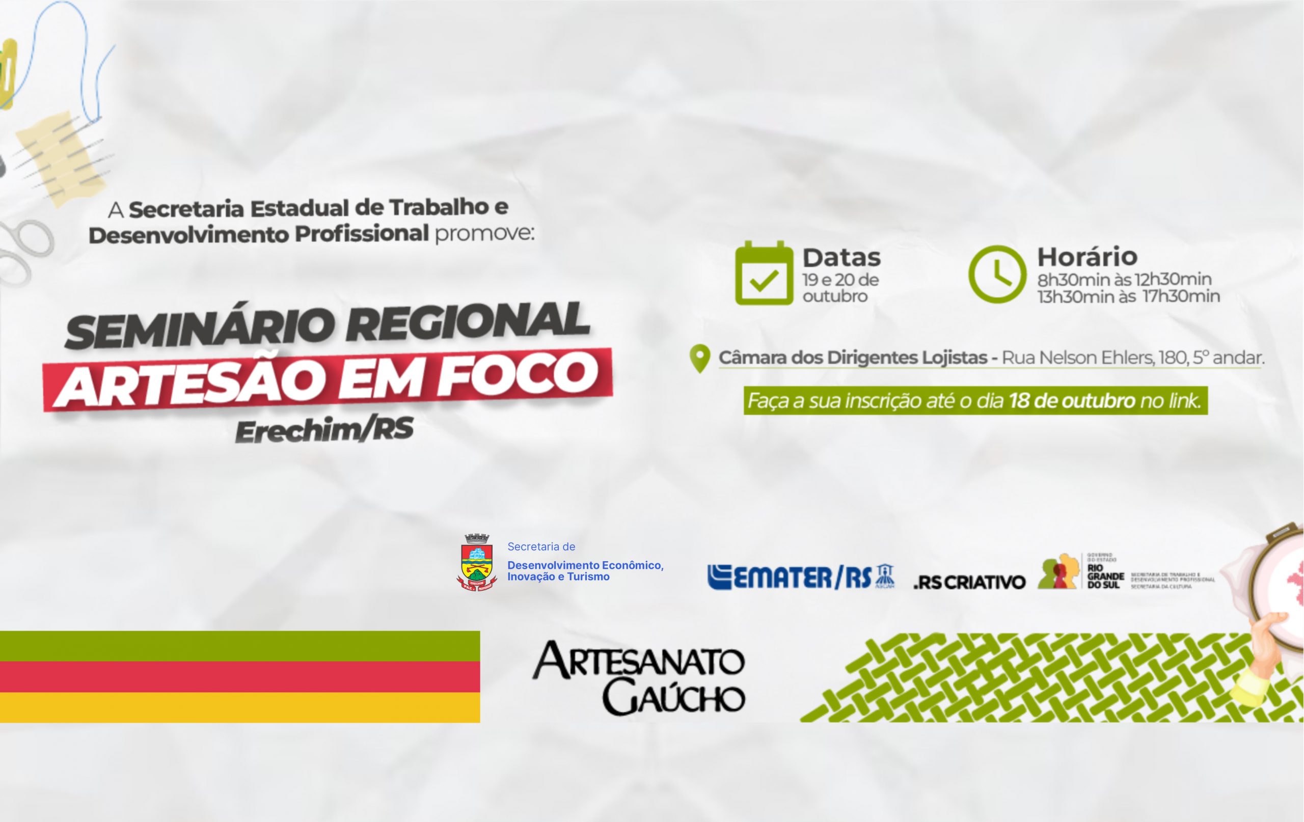 O Governo do Estado, por meio da Secretaria de Trabalho e Desenvolvimento Profissional (STDP), em parceria com o RS Criativo e a Secretaria de Desenvolvimento Econômico, Inovação e Turismo, promove o Seminário Regional Artesão em Foco nos dias 19 e 20 de outubro, na Câmara dos Dirigentes Lojistas (CDL) de Erechim, que fica na Rua Nelson Ehlers, 180 – 5° Andar. As inscrições são gratuitas e podem ser feitas até o dia 18 de outubro, por meio de formulário online, clicando aqui. A iniciativa conta com apoio da Secretaria Municipal de Desenvolvimento Econômico, Inovação e Turismo.
