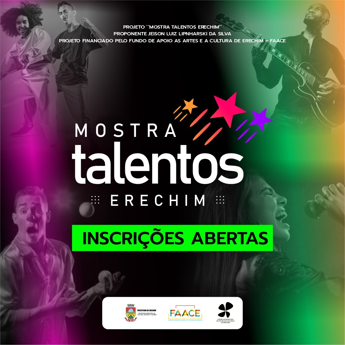 Erechim será palco da 1ª Mostra de Talentos que irá revelar e premiar artistas locais. A seletiva já está com inscrições abertas. A Mostra é um dos projetos culturais aprovados pelo Edital FAACE – Fundo de Apoio as Artes e a Cultura de Erechim, realizado pela Prefeitura de Erechim, Secretaria de Cultura e Esporte e Conselho Municipal de Políticas Culturais de Erechim. O evento vai permitir a participação de artistas, grupos, entidades culturais, e talentos individuais. “Nosso projeto busca democratizar a participação de todos aqueles que fazem arte e cultura de forma regular e amadora. O candidato não precisa estar necessariamente ligado a uma entidade ou grupos já existentes, o que permite a participação individual (solo) ou a união de artistas”, explica o proponente do projeto, Jeison Luiz Lipnharski da Silva.