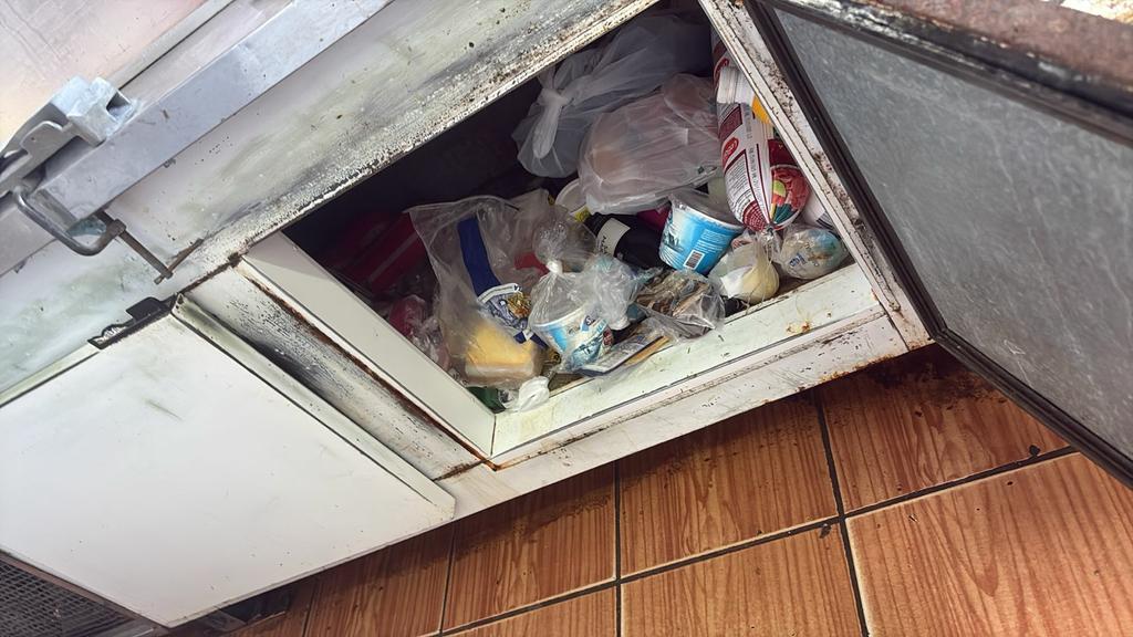 Durante a fiscalização, foram constatadas diversas irregularidades, como a ausência de indicação de procedência, armazenamento inadequado, alimentos fora da temperatura correta e grande quantidade de carne sem origem comprovada. Também foram identificados produtos mal embalados e fracionados de forma irregular, além de condições precárias de conservação.