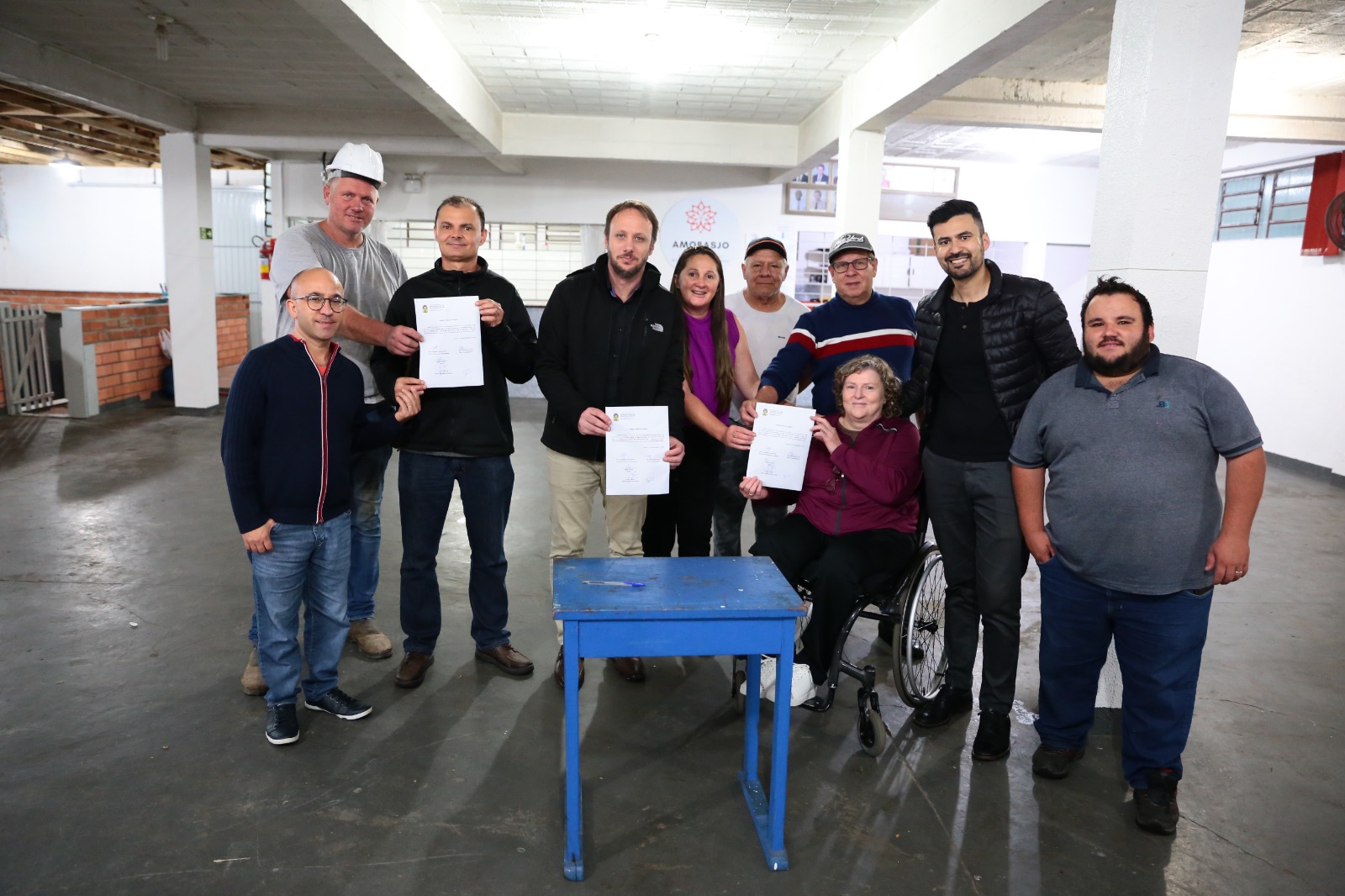 O prefeito em exercício de Erechim, Flávio Tirello, assinou o termo de início das obras do Salão Comunitário da Associação dos Moradores do Bairro São José, localizado na rua Alberto Pescador, na manhã desta quinta-feira (16). As reformas serão feitas pela empresa MB Construção Ltda., com recursos de emenda impositiva do vereador, Nadir Barbosa, por meio do programa Meu Bairro Melhor, que destinou R$ 25 mil para as melhorias.