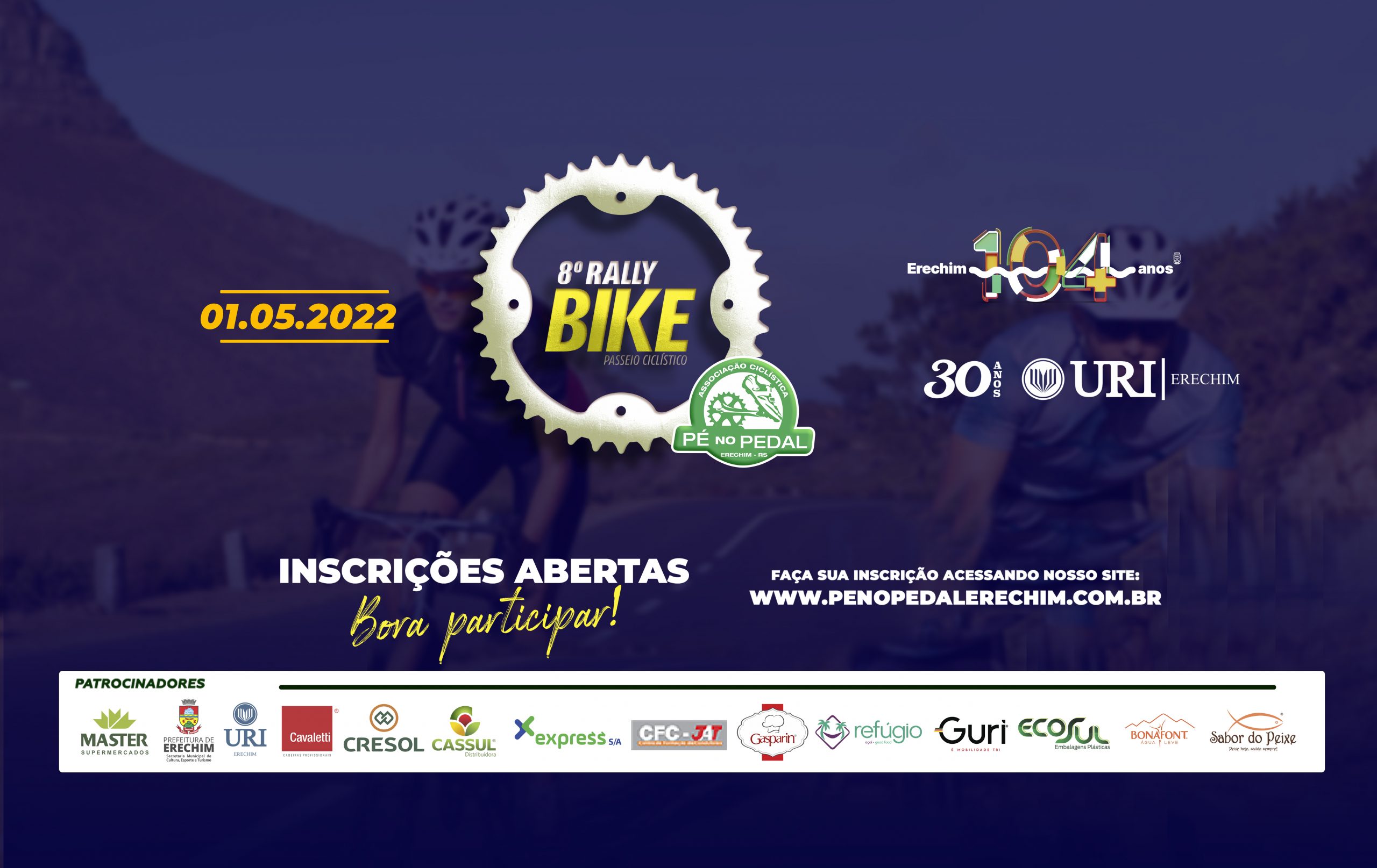A Prefeitura de Erechim, através da Secretaria Municipal de Cultura e Esporte é uma das apoiadoras do 8º Rally Bike – Pé no Pedal, que vai acontecer no dia 1º de maio de 2022, integrando a programação dos 104 anos de Erechim. A realização da prova é da Associação Ciclística Pé no Pedal.
