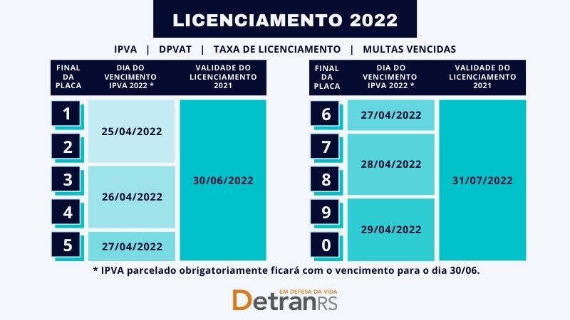 Embora o vencimento do IPVA (Imposto Sobre a Propriedade de Veículos Automotores) 2022 ocorra ao longo desta semana, o Detran-RS (Departamento Estadual de Trânsito) lembra que é possível circular com o documento de 2021 até 30 de junho (placas com final 1 a 5) ou 31 de julho (placas com final 6 a 0).