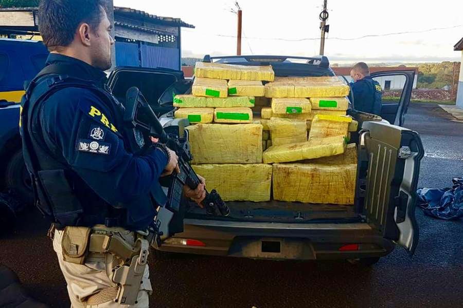O flagrante ocorreu após perseguição na rodovia e interceptação em uma barreira montada. O veículo estava carregado de fardos com 555 quilos de maconha, levados sobre os bancos dos passageiros e no compartimento de carga.