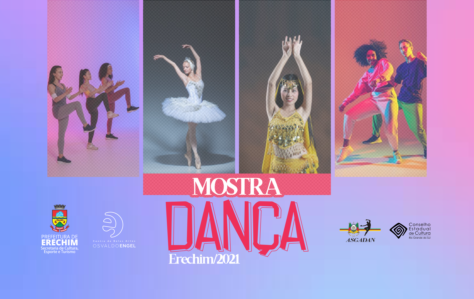 A Prefeitura de Erechim, por meio da Secretaria de Cultura, Esporte e Turismo e o Colegiado Setorial de Dança realizam neste domingo (7), a Mostra Dança Erechim 2021. O evento conta com o apoio do Conselho Estadual de Cultura do Rio Grande do Sul (CECRS), da Associação Gaúcha de Dança (ASGADAN) e do Centro de Belas Artes Osvaldo Engel – cultural, técnico e profissional.