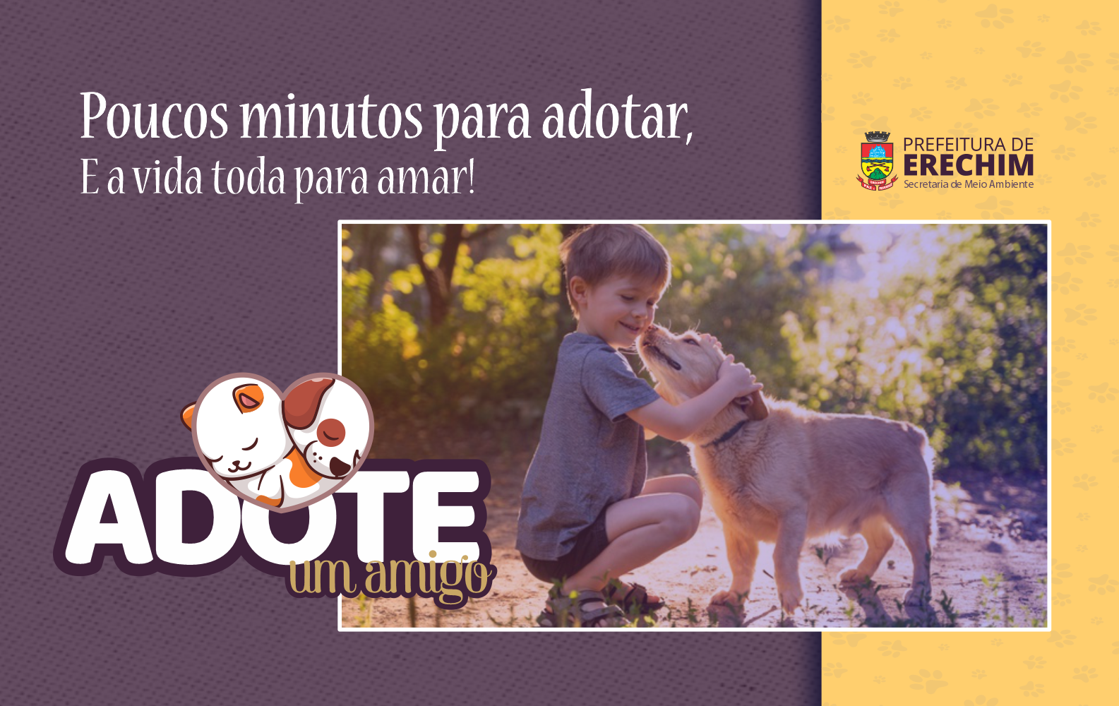A Prefeitura de Erechim lança a Campanha Adote um Amigo, através de um conjunto de ações promovidas pela Secretaria de Meio Ambiente e entidades parceiras para enfatizar a importância de dar um lar a bichos abandonados e valorizar a proteção daqueles que estão nas ruas.