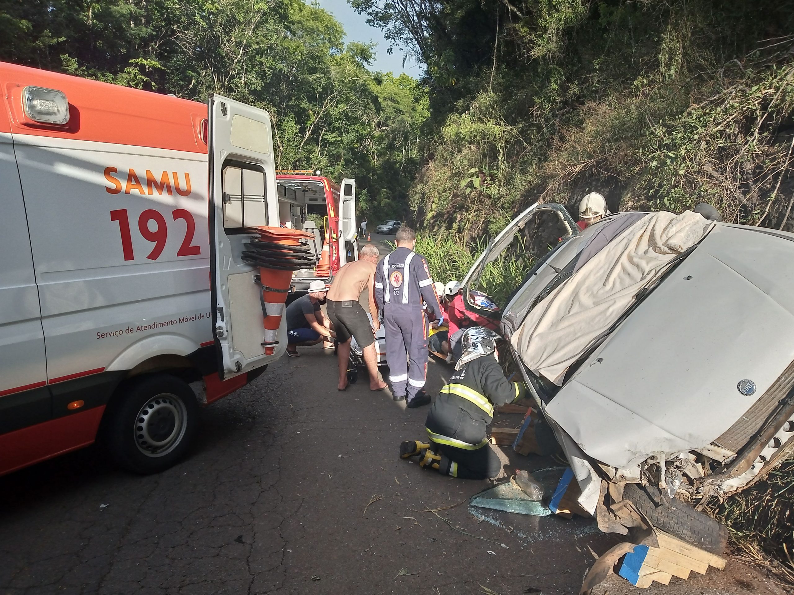 Dentro do veículo estava um casal de idosos. Os dois sofreram ferimentos, porém estavam comunicativos e estáveis. O veículo ficou tombado na via lateral direita. Os Bombeiros Voluntários de Concórdia e uma equipe do Samu foram ao local e fizeram os atendimentos.