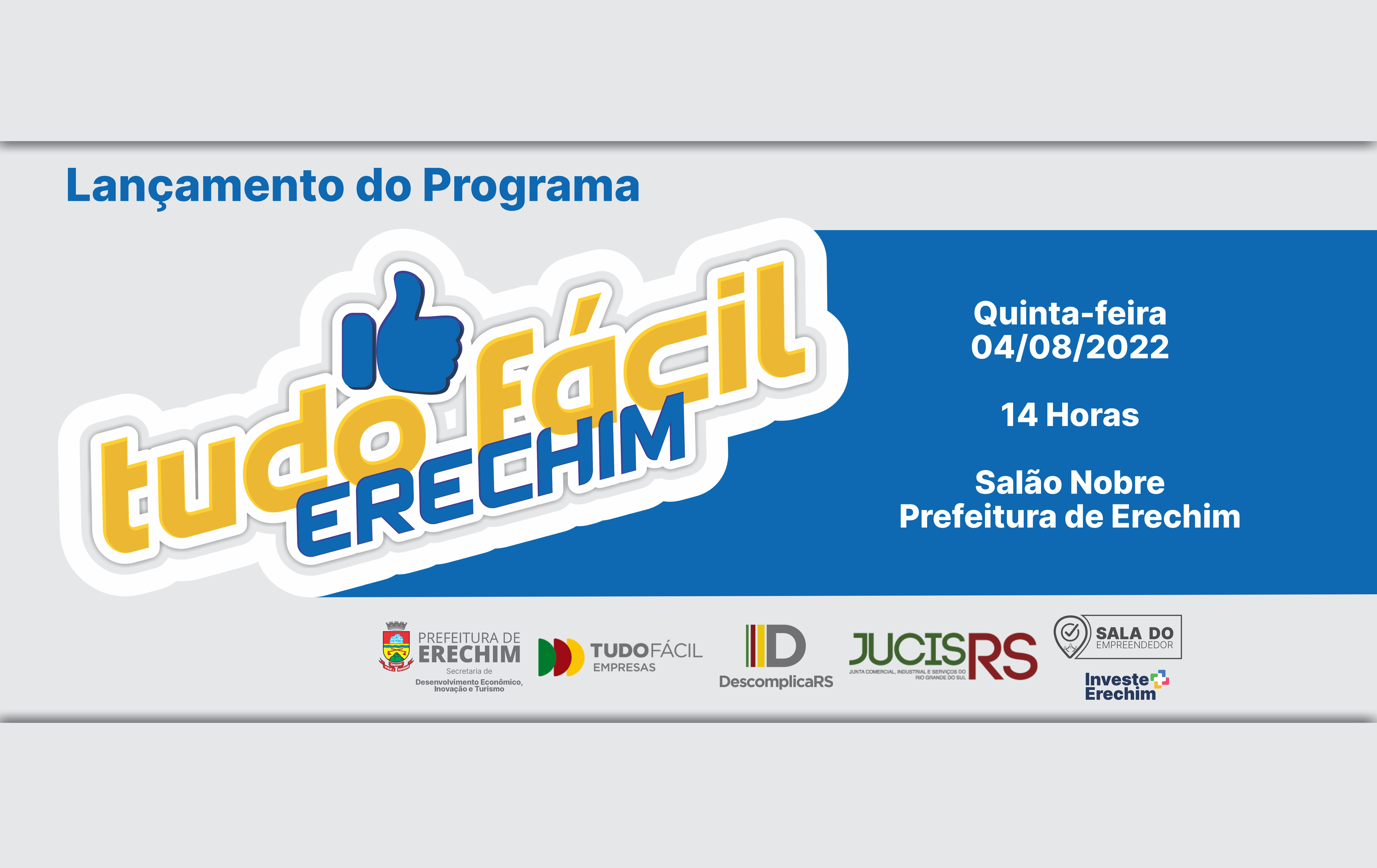 Na próxima quinta-feira (4), a Prefeitura de Erechim, através da Secretaria Municipal de Desenvolvimento Econômico, Inovação e Turismo e Sala do Empreendedor lança o Tudo Fácil Erechim, que é regulamentado através da Lei Municipal 7.083/2022, aderindo ao Tudo Fácil Empresas e isenta os empreendimentos do município, da taxa de funcionamento inicial na abertura da empresa.